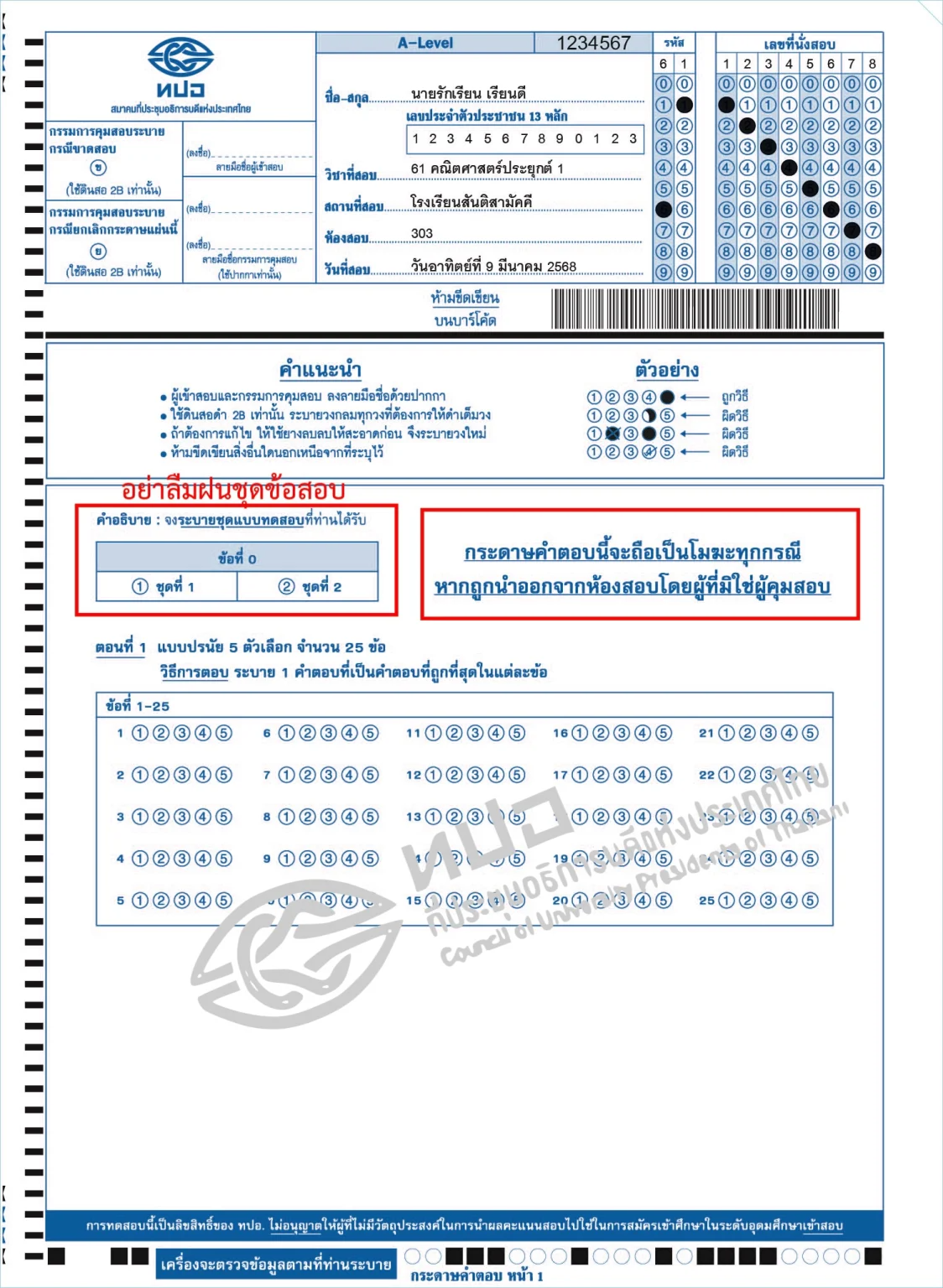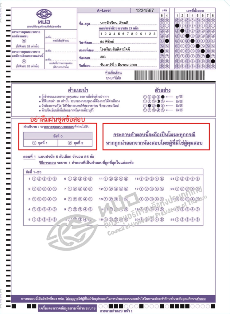 นั่นหมายความว่าถ้าน้อง ๆ ลืมฝนชุดข้อสอบและไม่ได้เขียนเลขชุดข้อสอบในใบเซ็นชื่อด้วย ก็จะทำให้เสียคะแนนในข้อสอบชุดนั้นไปเลยนั่นเอง