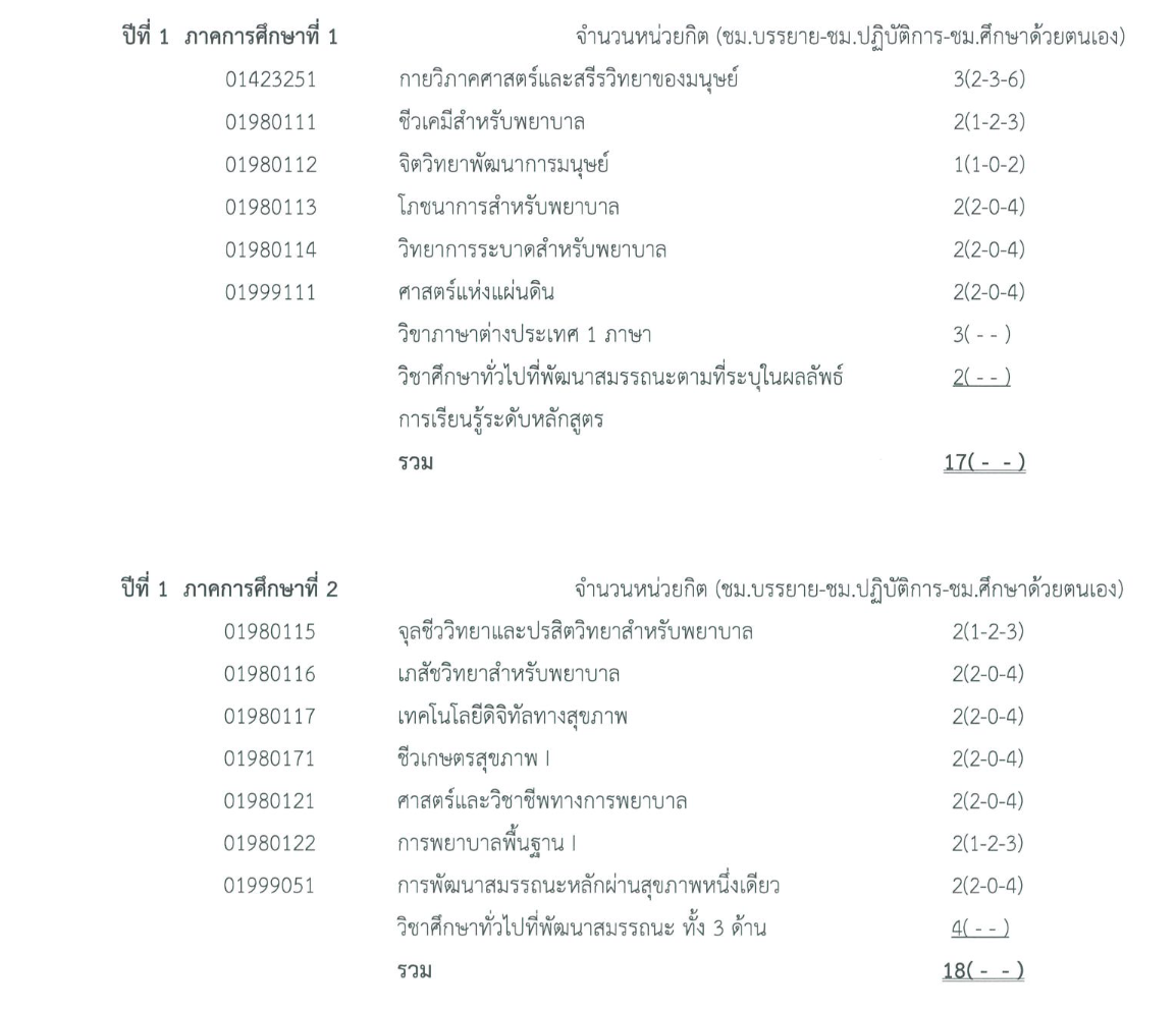 สำหรับปี 1 น้อง ๆ จะได้เรียนวิชาทั่วไปของมหาลัยฯ, เรียนวิชาพื้นฐานของคณะอย่างกายวิภาคศาสตร์และวิชาพื้นฐานอื่น ๆ ที่เกี่ยวข้องเช่น โภชนาการสำหรับพยาบาล, เภสัชวิทยาสำหรับพยาบาล, การพยาบาลพื้นฐาน เป็นต้น