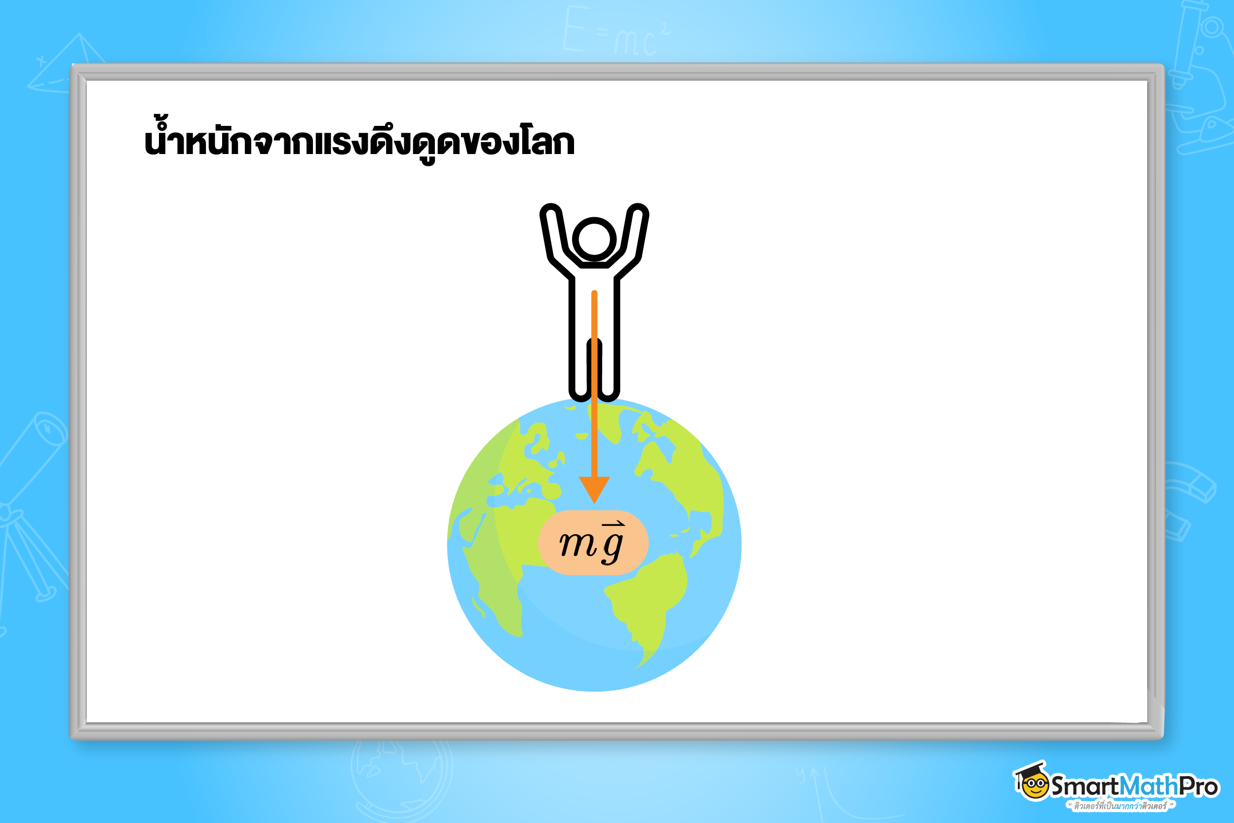จากกฎข้อที่สองของนิวตัน \sum \vec{F}=m\vec{a} เราสามารถเขียนความสัมพันธ์ของน้ำหนักได้ว่า