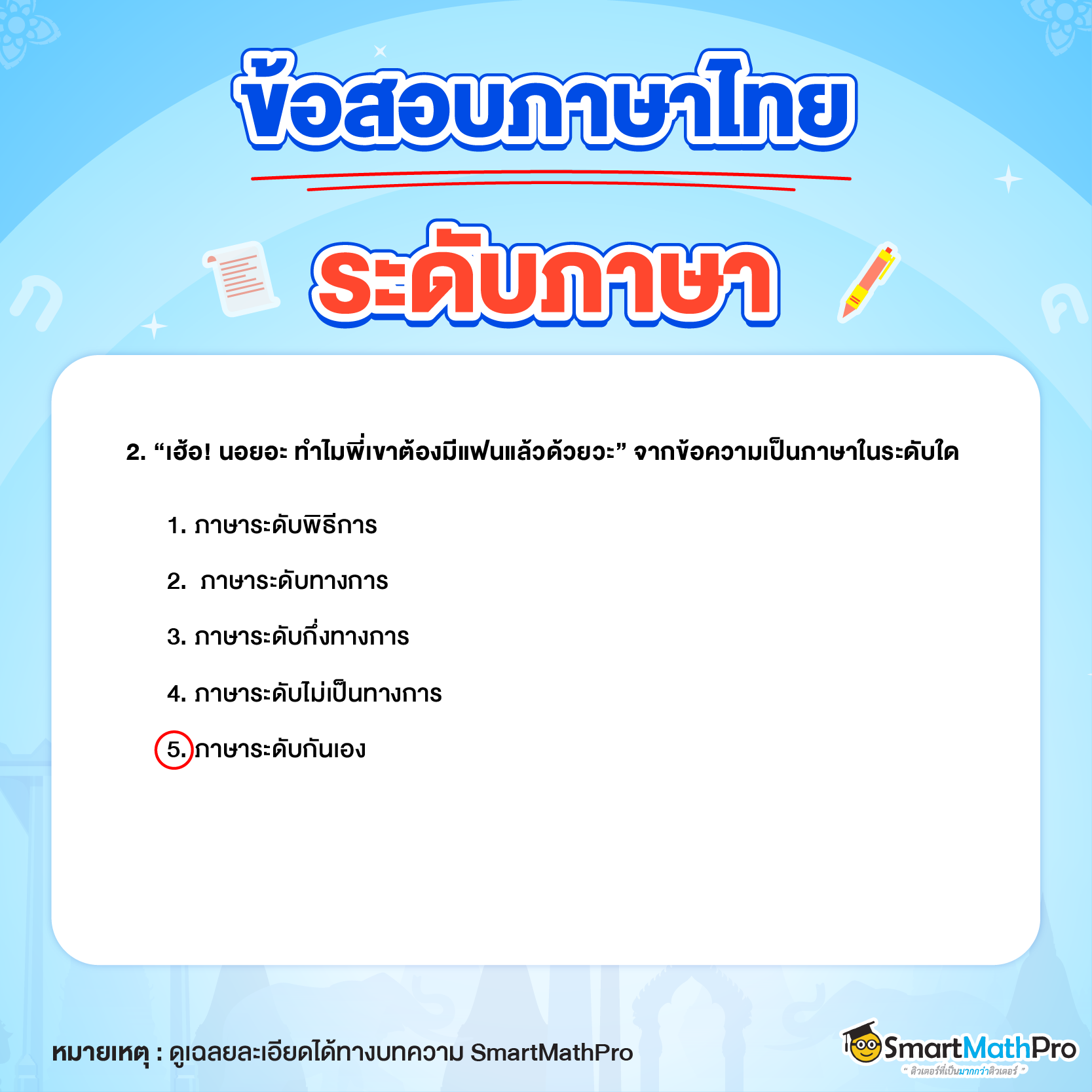 ระดับภาษาเป็นเนื้อหาที่สำคัญมาก เพราะเป็นเรื่องที่เราใช้สื่อสารในชีวิตประจำวัน และยังเป็นเนื้อหาที่น้อง ๆ จะได้เจอทั้งในข้อสอบที่โรงเรียนและข้อสอบสำหรับเข้ามหาลัยฯ อย่าง A-Level ภาษาไทยด้วย ดังนั้นเพื่อให้ทุกคนใช้ระดับภาษาได้