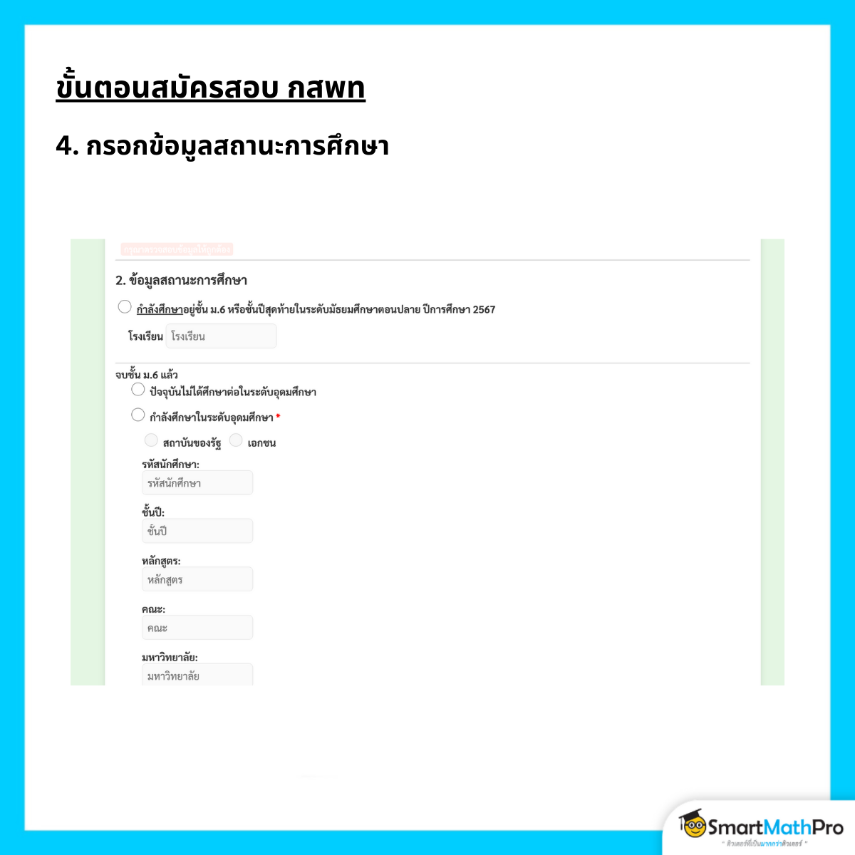 4. กรอกข้อมูลสถานะการศึกษา เสร็จแล้วกดปุ่ม “ขั้นตอนต่อไป” หากต้องการกลับไปแก้ไขข้อมูลก่อนหน้า ให้กดปุ่ม “ย้อนกลับ”