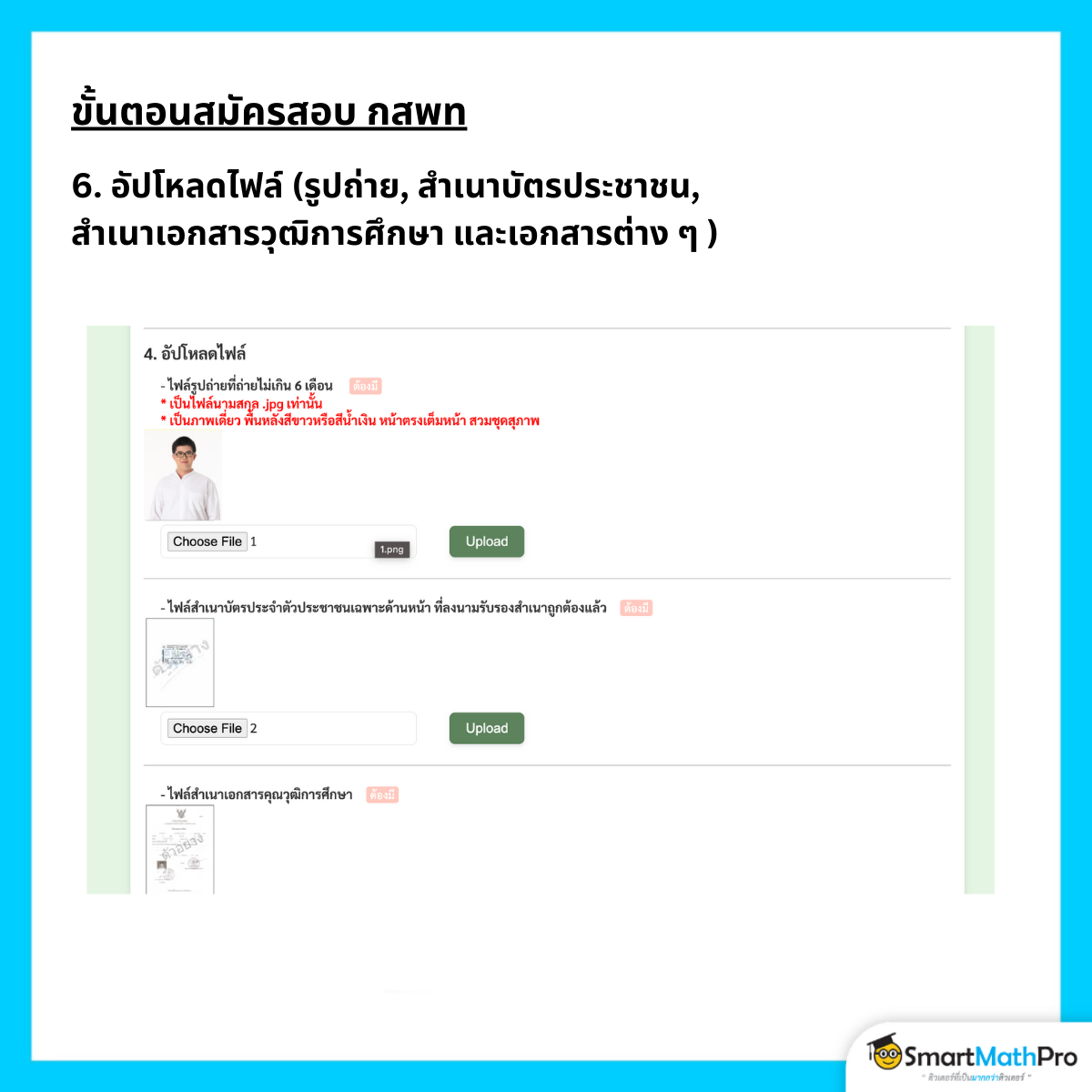 6. อัปโหลดไฟล์เอกสารประกอบการสมัครสอบ