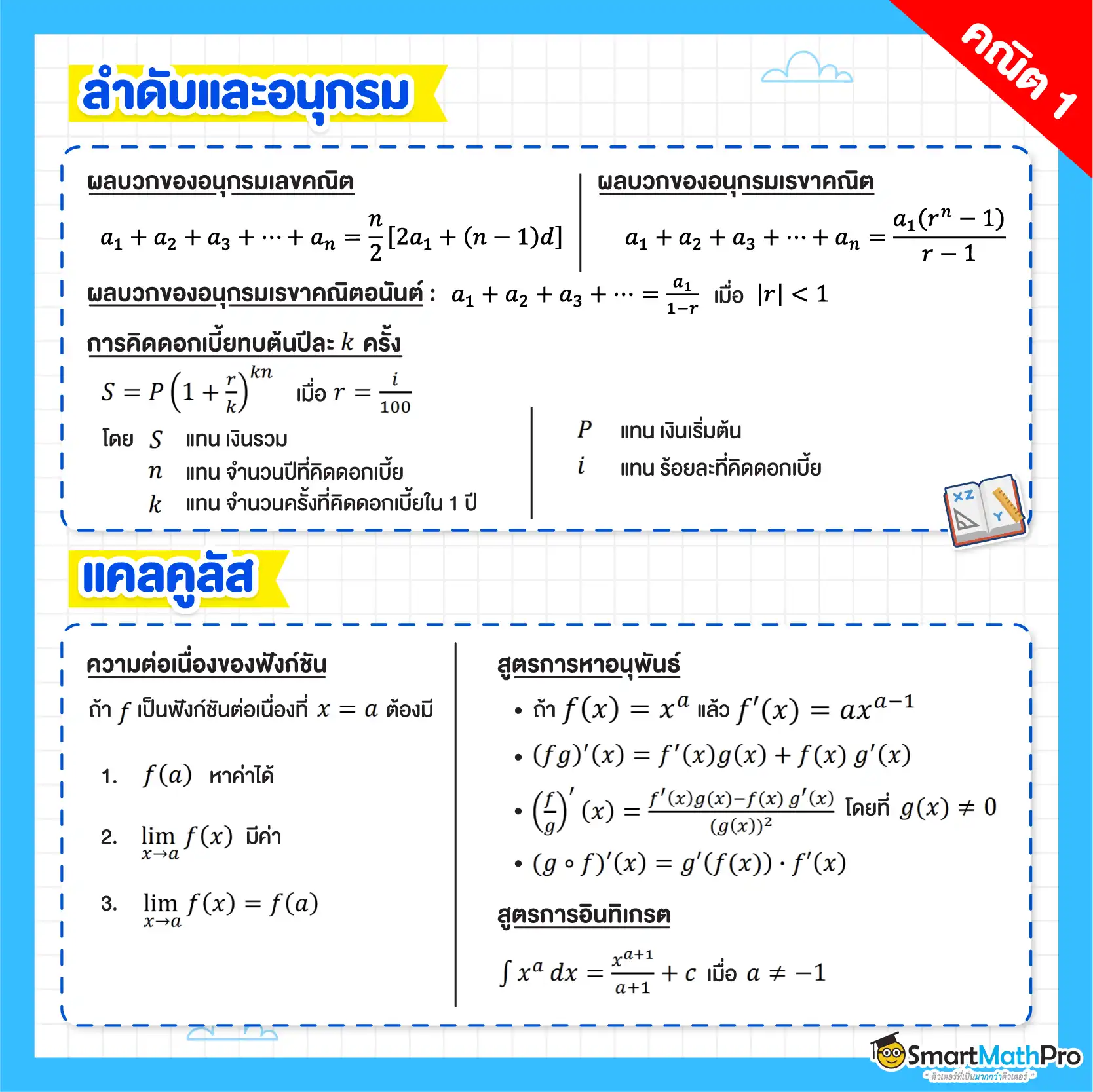 ในบทนี้ น้อง ๆ ควรทบทวนเพิ่มเติมในหัวข้อรูปแบบของลิมิตของลำดับ และสมบัติของลิมิตของลำดับน้า และยังมีสูตรของอนุกรมเทเลสโคปิกที่อยู่ในรูปเศษส่วนที่ต้องสามารถจัดรูปได้ รวมถึงสมบัติของซิกมาที่น่าใช้ในห้องสอบ นอกจากนี้ยังมีการคิดดอกเบี้ยหรือค่างวด ที่ข้อสอบมักออกทุก ๆ ปีด้วย