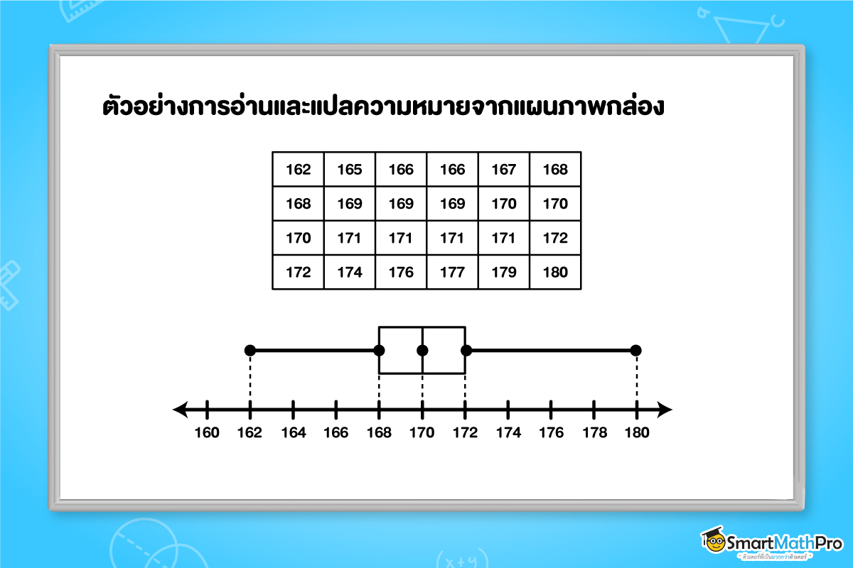คำถามก็คือ แล้วแผนภาพกล่องแสดงการกระจายของข้อมูลให้เห็นได้อย่างไร รวมไปถึงข้อมูลอื่น ๆ ที่ได้จากการอ่านแผนภาพกล่อง สามารถสรุปได้อย่างไรบ้าง พี่มีตัวอย่างให้น้องได้ดู ตามนี้เลยย