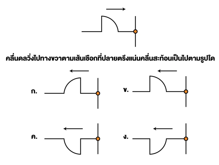คลื่นที่สะท้อนจะวิ่งกลับในทิศทางตรงกันข้ามกับคลื่นตกกระทบ (จากขวาไปซ้าย) ดังนั้น ข้อ ง.
